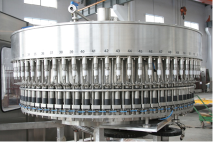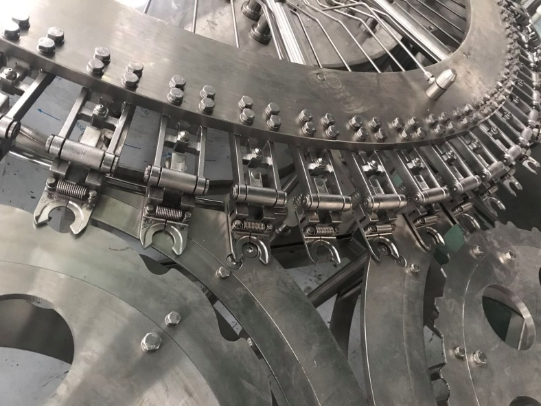 The filling mono-bloc works as follows: Bottles are fed from conveyor chain into the filling machine mono-bloc via star wheel. Bottle clamp installed on the rotary wheel of the rinse will grip bottle mouth and make a 180° turn along a guide track to face the bottle mouth downward. In designated section of the rinse, rinsing water will jet out from special nozzles to flush bottle inside wall. After rinsing and dripping, bottles gripped by bottle clamp will make another 180° turn along a guide track to resume bottle mouth facing up position. Clean bottles are discharged out of the rinse by a star wheel to feed the filler. After entering the filler, bottles are retained by neck supporting carrier plates, which are actuated by bottle carrier mechanism to raise them to engage with filling valves. Filling valves are opened by bottle presence signals. After finishing filling, valves are closed by valve closing mechanism to further stop venting to complete the filling process. Bottle carrier mechanism is lowered by a cam to disengage filled bottles with filling valves. Then bottles are transferred into the capper by a neck handling star wheel. Anti-rotation blades on capping heads will seize the bottleneck to prevent it from rotation and hold it in a upright position. The twist-on capping head will make revolving and rotating movement along with the machine to finish the complete capping process of cap picking, placing, twisting, and disengaging under the control of a cam. A discharge star wheel discharges finished bottles onto discharge conveyor belt to be conveyed out of the filling mono-bloc.